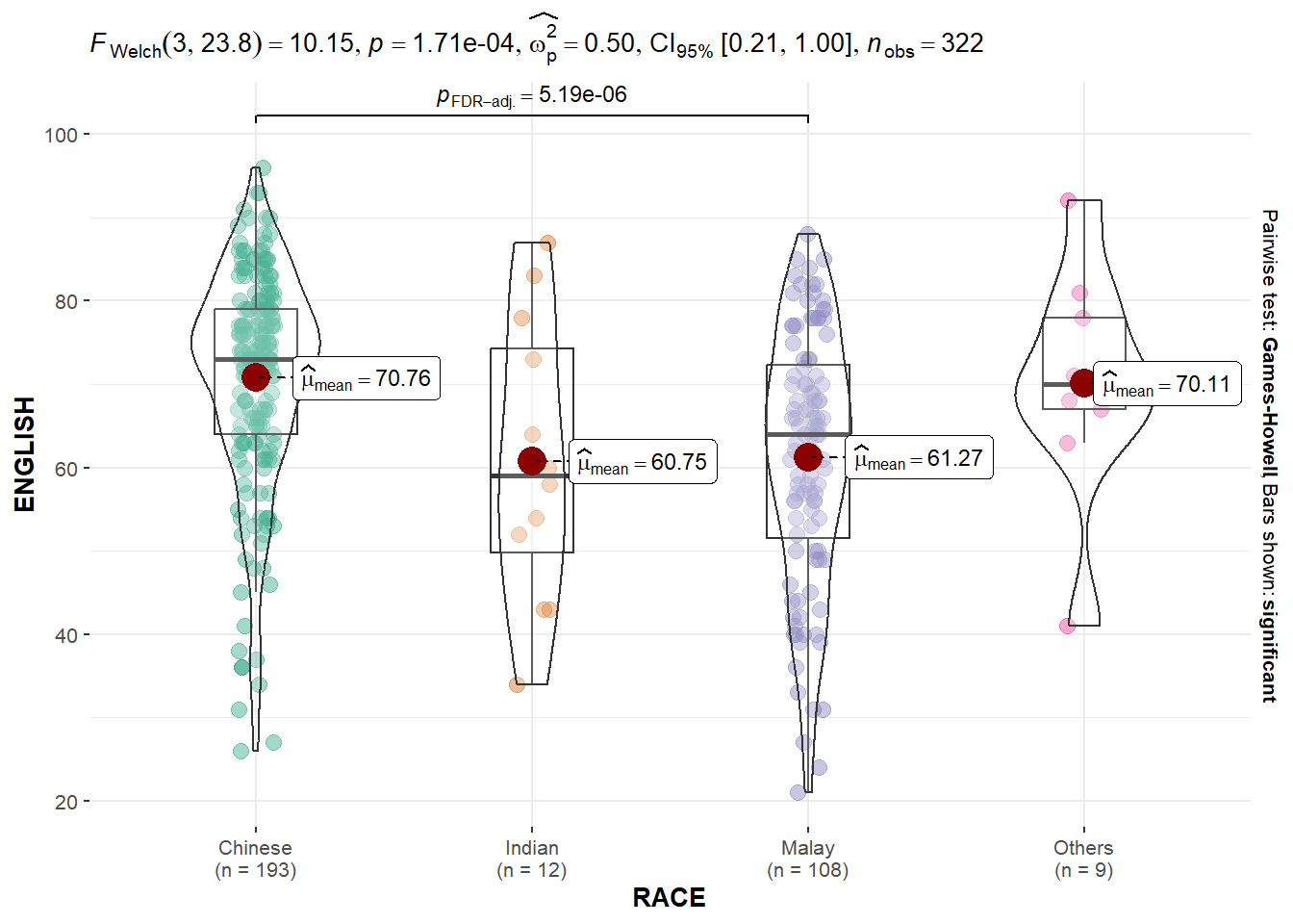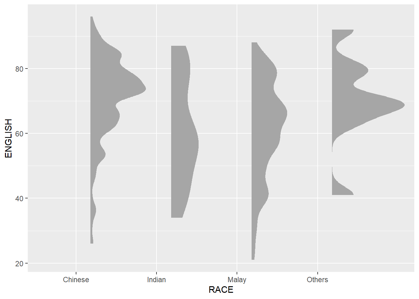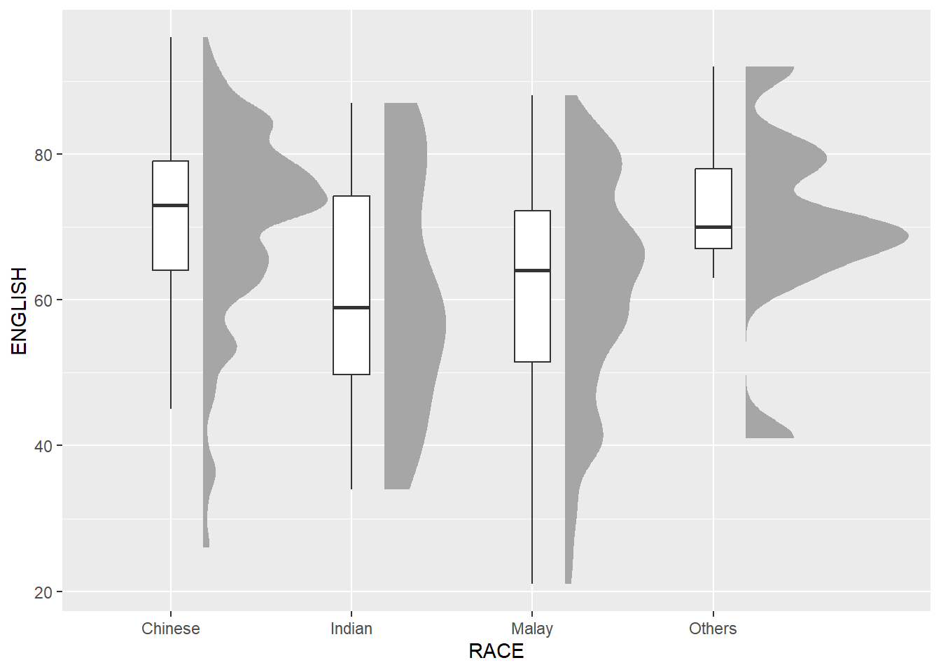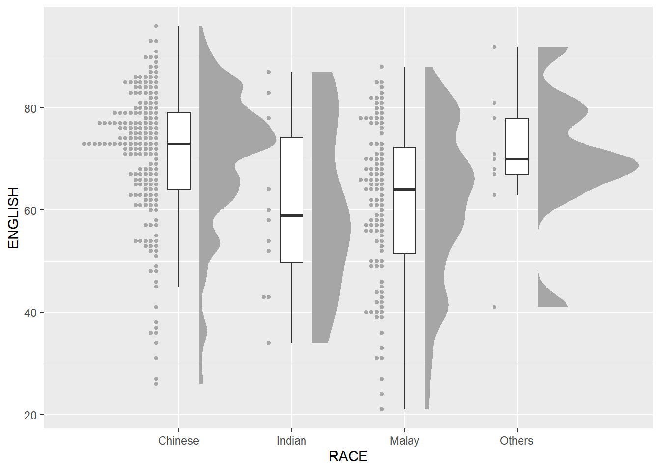 In this section, we will learn how to create a raincloud plot to visualise the distribution of English score by race. It will be created by using functions provided by ggdist and ggplot2 packages.