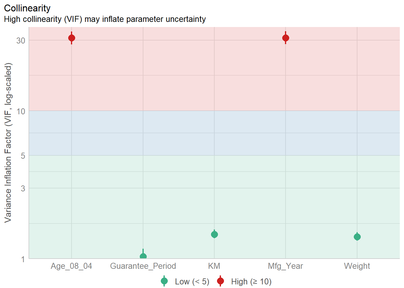 lm(formula = Price ~ Age_08_04 + Mfg_Year + KM + Weight + Guarantee_Period,