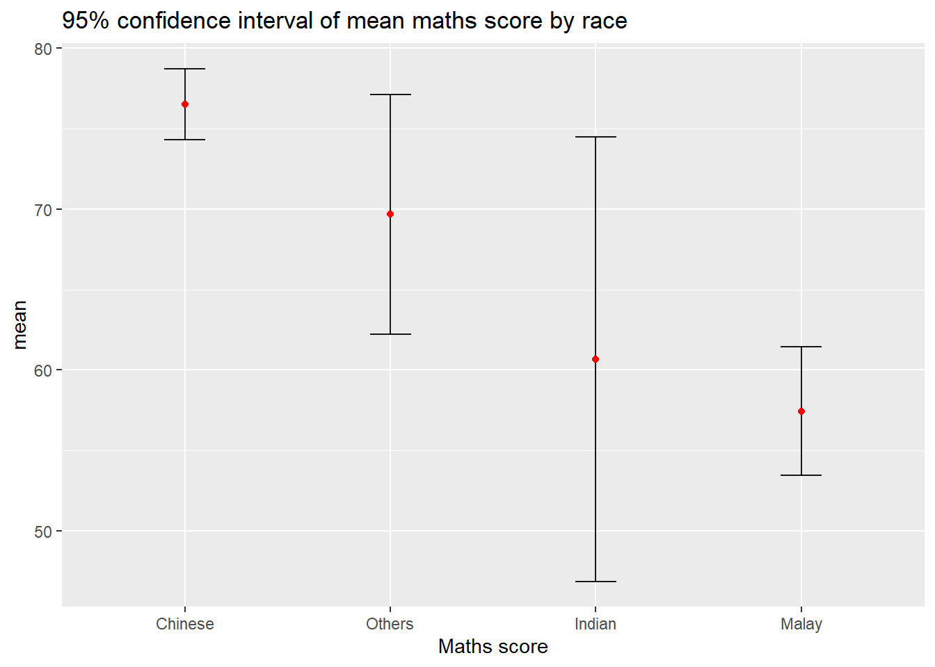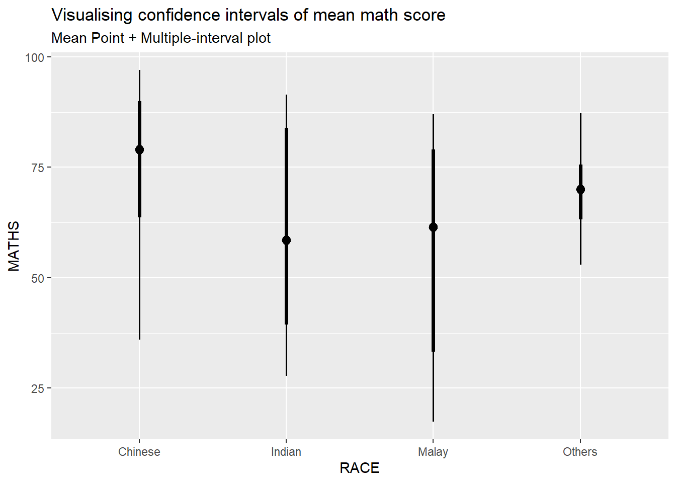 In the code chunk below, stat_pointinterval() of ggdist is used to build a visual for displaying distribution of maths scores by race.