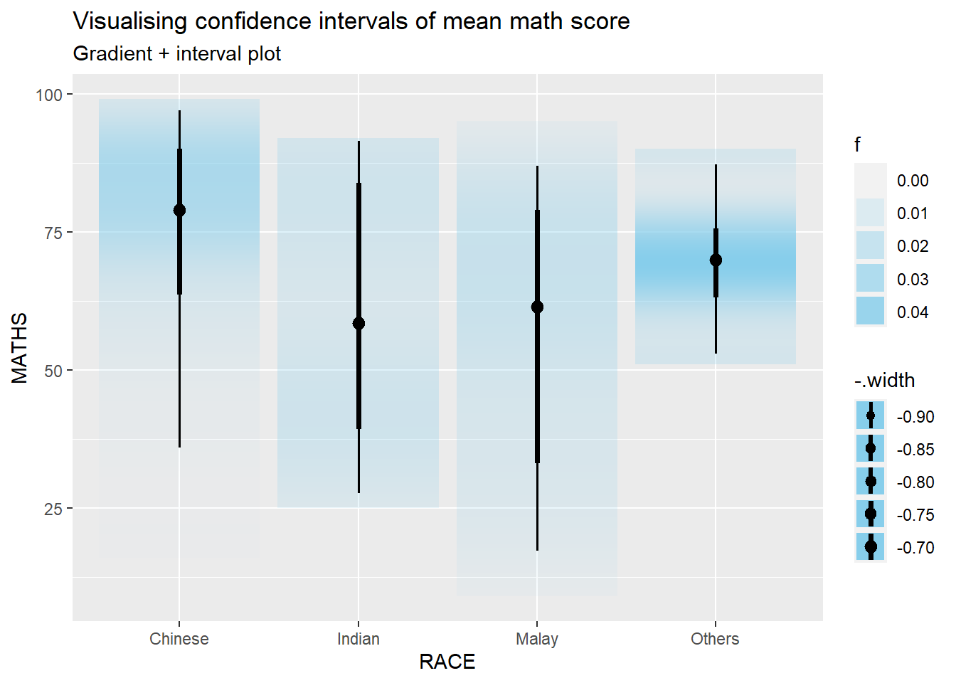 In the code chunk below, stat_gradientinterval() of ggdist is used to build a visual for displaying distribution of maths scores by race.