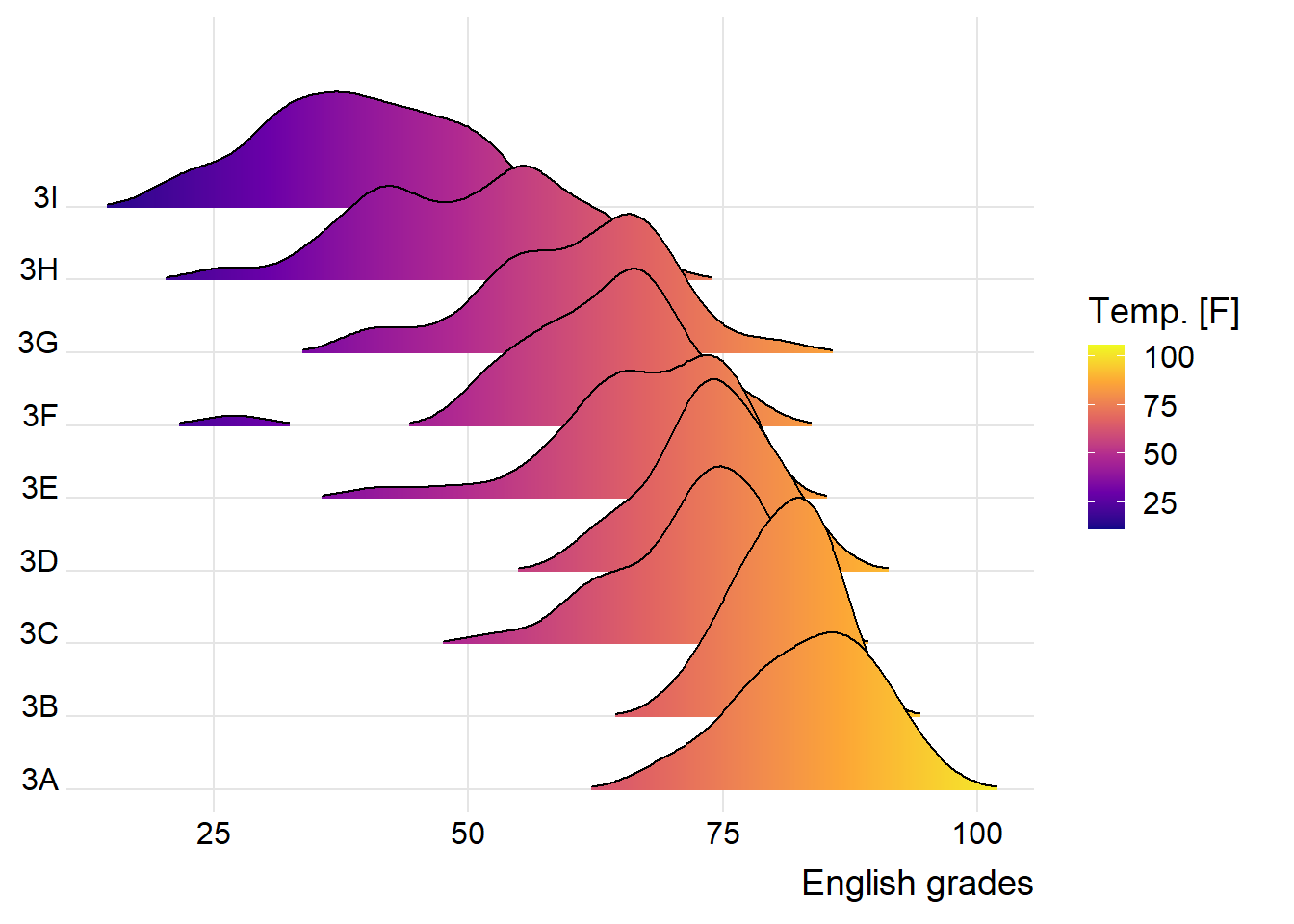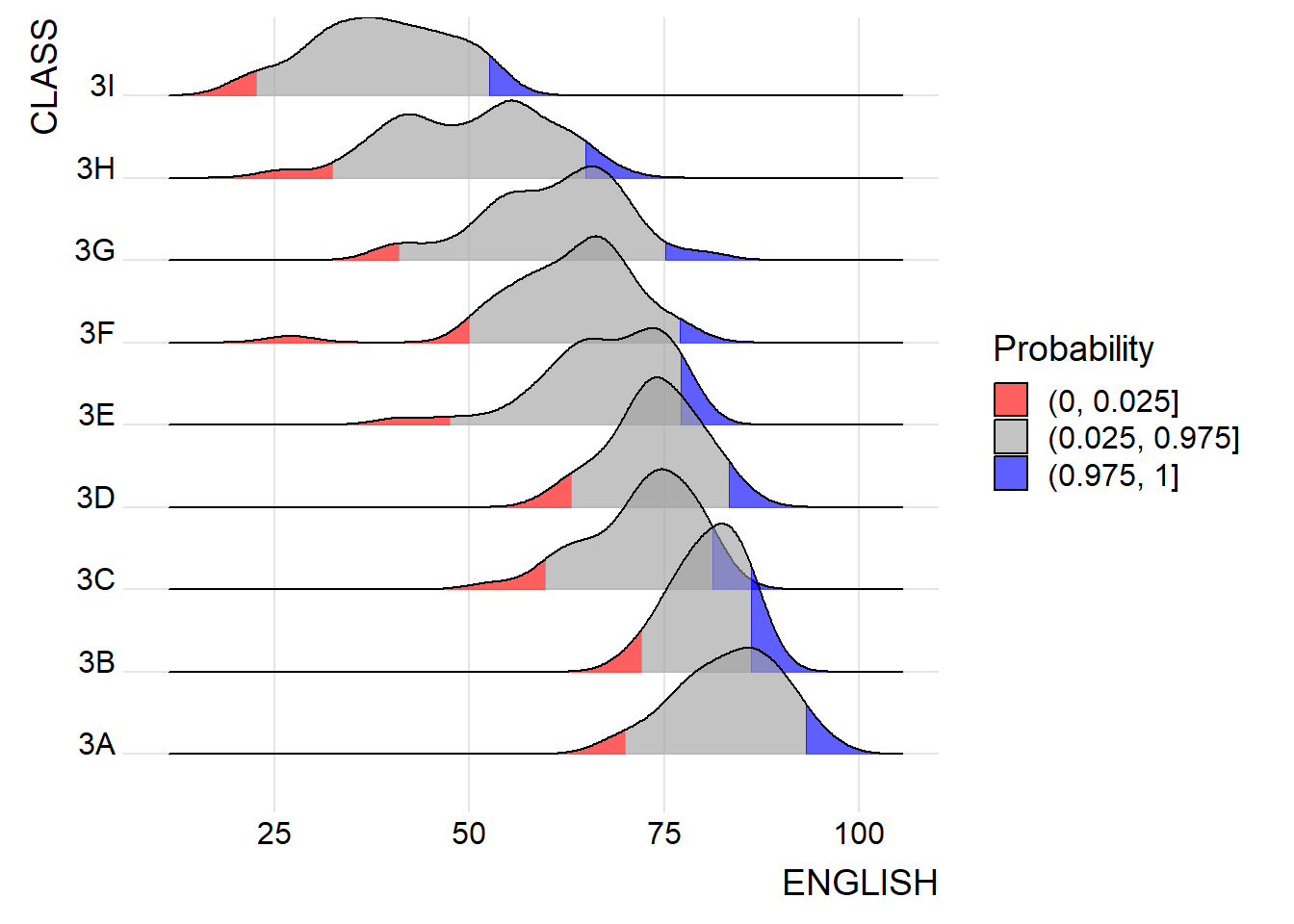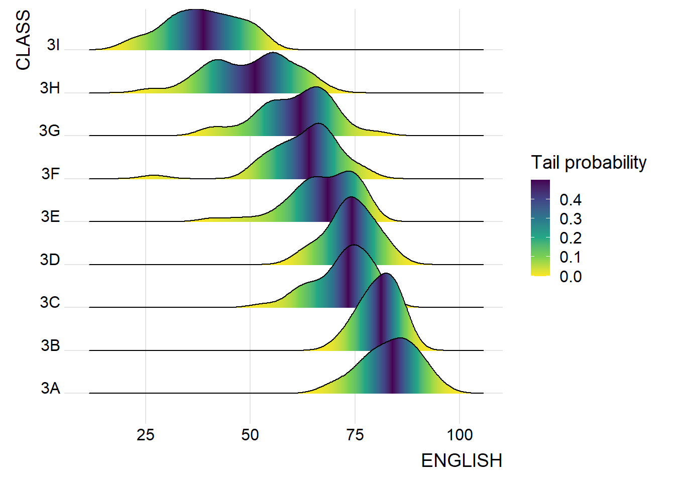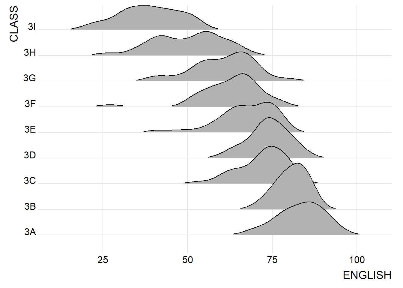 The figure below is a ridgelines plot showing the distribution of English score by class.