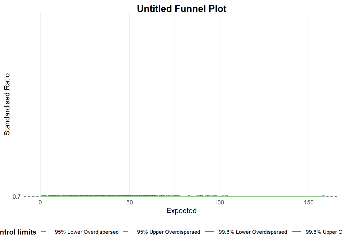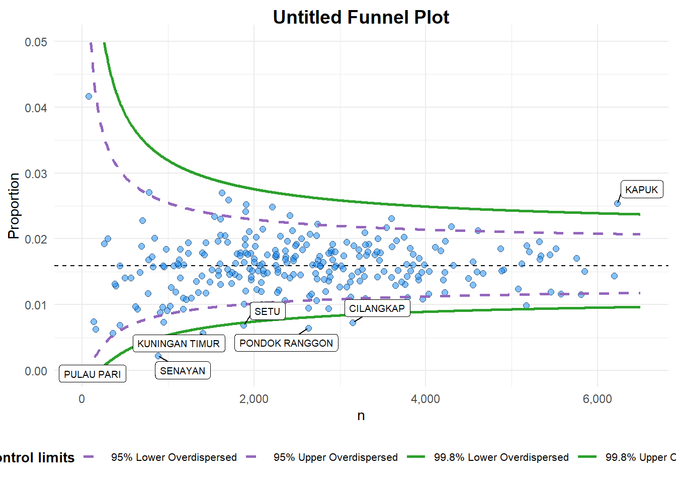 Funnel Plots for Fair ComparisonsFunnelPlotR package uses ggplot to generate funnel plots. It requires a numerator (events of interest), denominator (population to be considered) and group. The key arguments selected for customisation are: