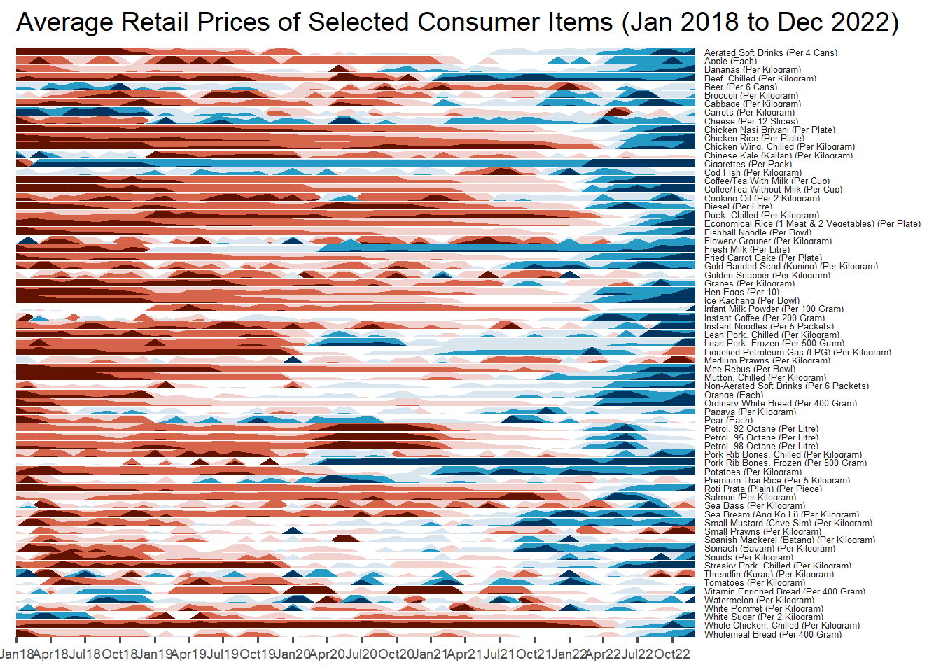 ggtitle('Average Retail Prices of Selected Consumer Items (Jan 2018 to Dec 2022)')